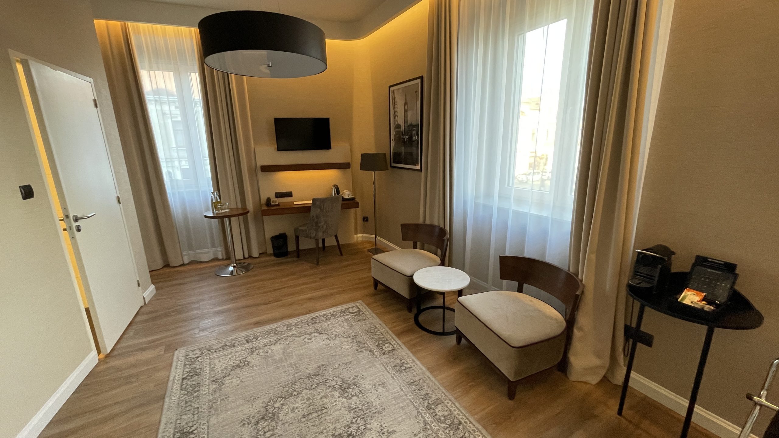 As I was staying for 2 nights they upgraded the room and I was very pleased with the style, comfort and space. There was a coffee machine as well as a kettle with tea provided plus 2 bottles of water.