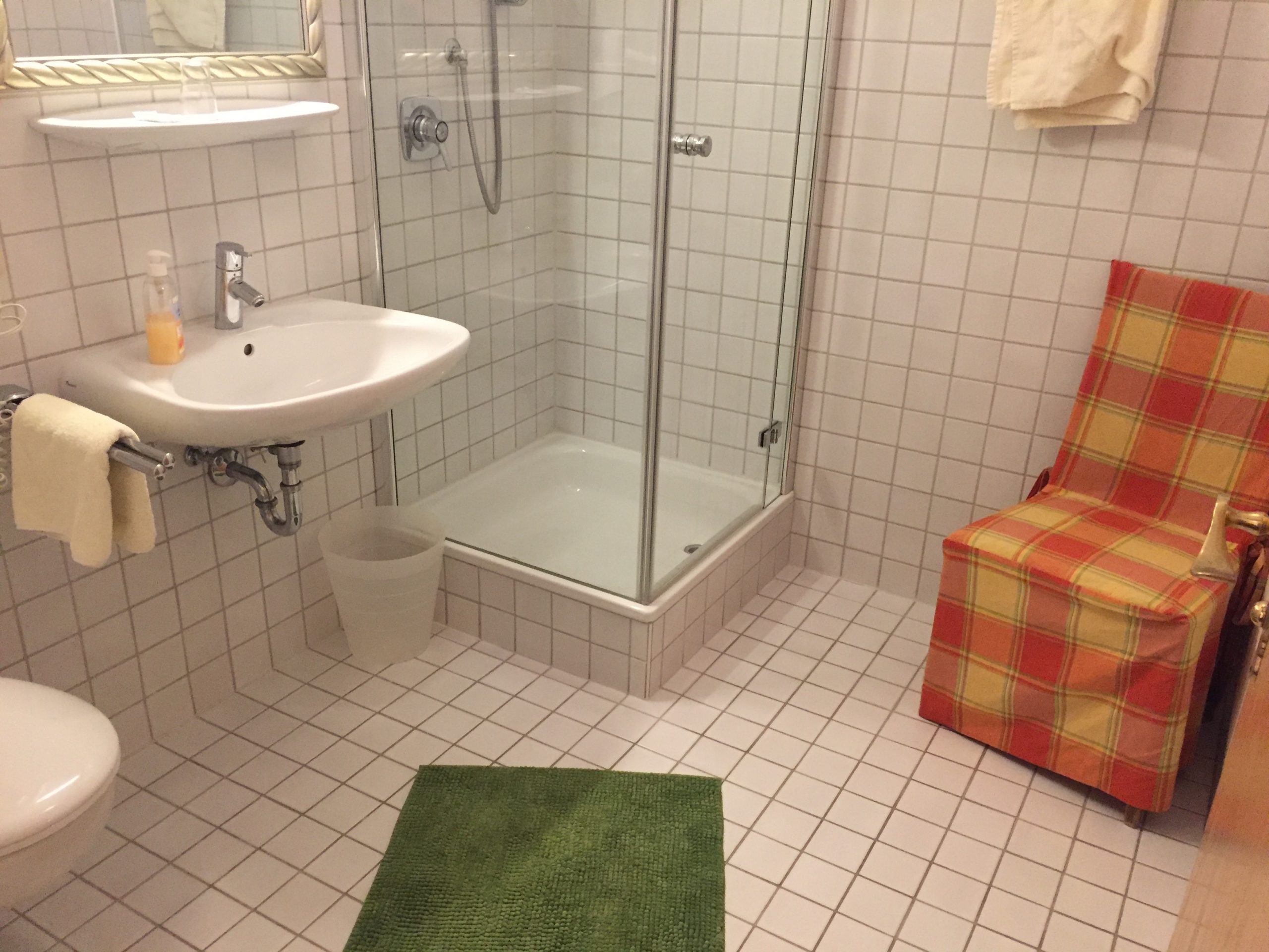 My room was located on the first floor, the hotel has no lift. The room was simply furnished in a rustic style and was very pleasant – located at the back of the hotel out of direct sunlight the room was cool on a very hot day, 35c, and with no air conditioning this was an advantage. The bathroom was clean and functional with good water pressure in the shower. Wifi worked well.